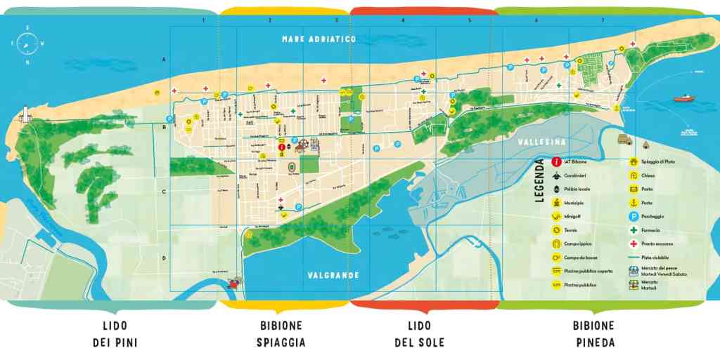 Nella cartina qui sopra, potete rendervi conto della vastità della spiaggia e dell’abitato di Bibione. Se è la prima volta che andate vi consiglio di noleggiare una bici, un risciò o un monopattino elettrico e di cominciare così a girare per la località, in modo da farvi una idea su che cosa troverete. Come punto di riferimento tenete Piazzale Zenith, che è il miglior punto di riferimento (è un parcheggio e spesso sede di concerti)