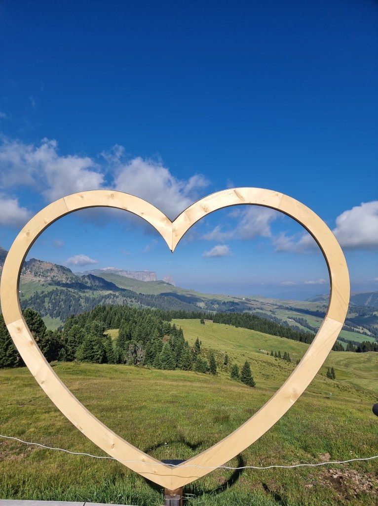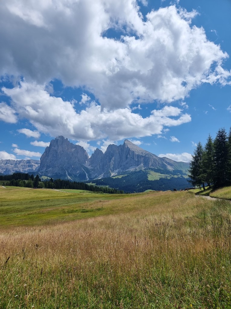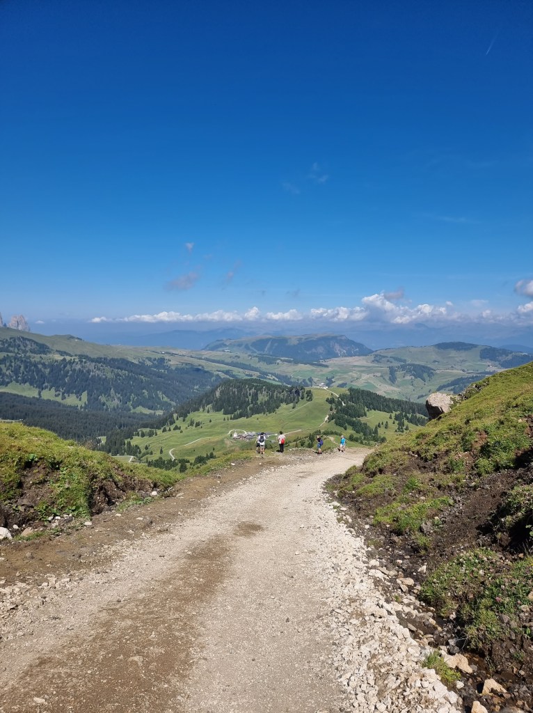 Il paesaggio che vi si presenterà davanti sarà bellissimo. Da una parte l’Alpe di Siusi in tutto il suo splendore con l’Alpe di Tires e lo Sciliar, dall’altra parte invece la Val di Fassa, la Marmolada, ecc…