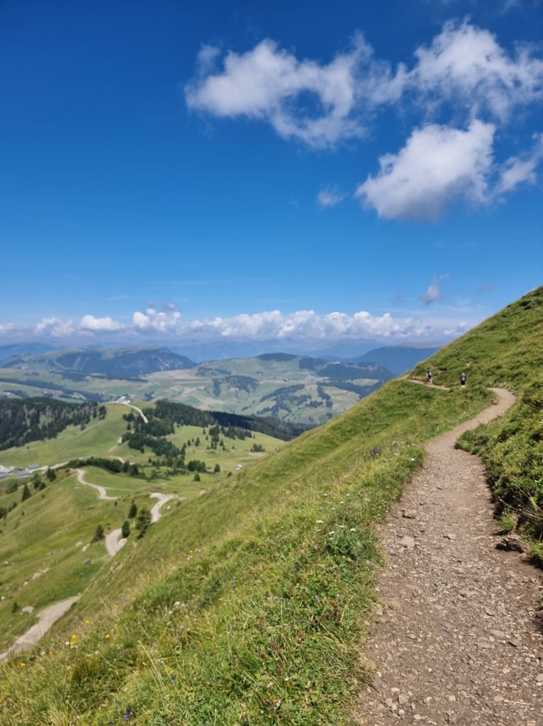 Questo sentiero è stretto e irregolare quindi bisogna prestare un po’ di attenzione. Costeggerete il fianco della montagna con un panorama incantevole verso l’Alpe di Siusi.