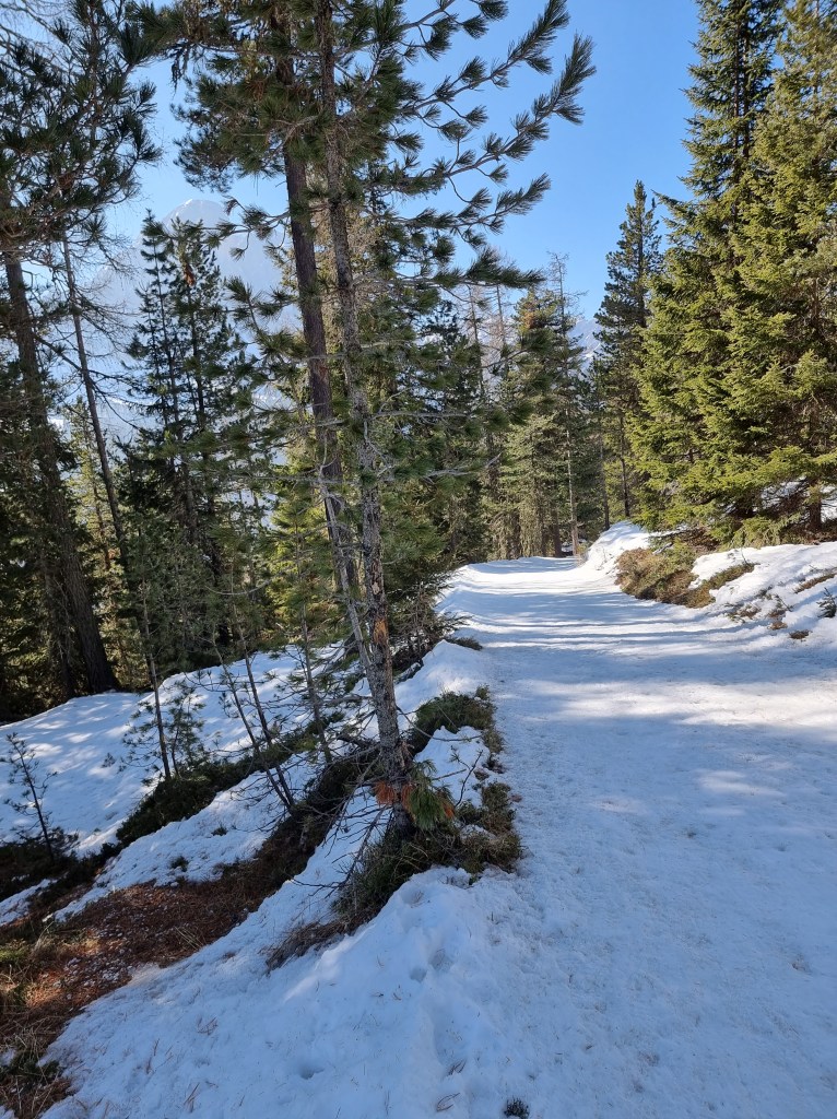 Nel parcheggio potete armarvi di ciaspole e partire seguendo il sentiero 1, verso Monte Muro. Il sentiero è praticamente una mulattiera ben battuta che si snoda, tra dolci saliscendi in mezzo al bosco di Cirmoli, Larici e Abeti Rossi.