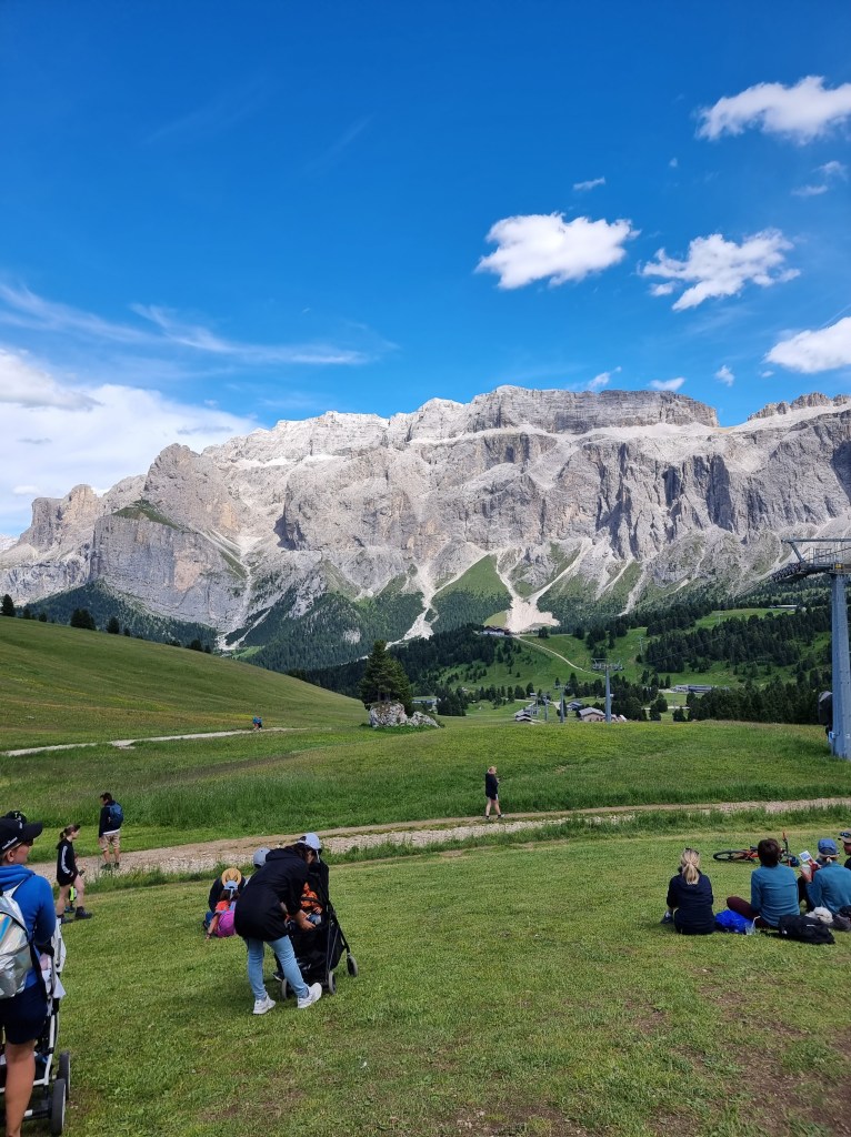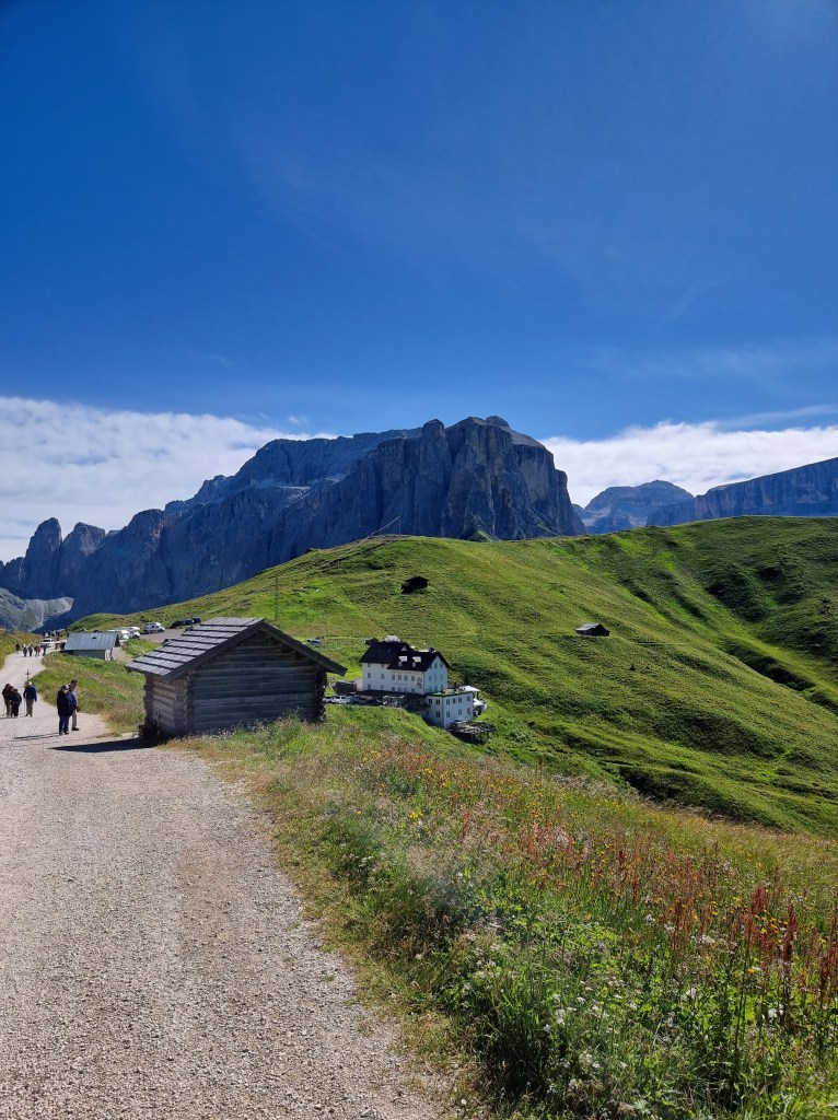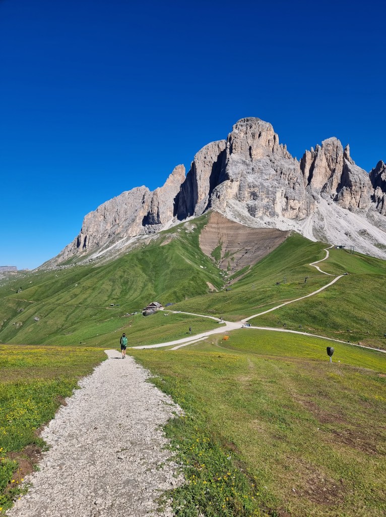 Da qui il sentiero prosegue facilmente in falsopiano e lieve discesa in direzione Passo Sella, passando prima attraverso verdi pascoli e poi attraverso la Città dei Sassi (se volete approfondire, basta scrivermi che vi do tutte le info).