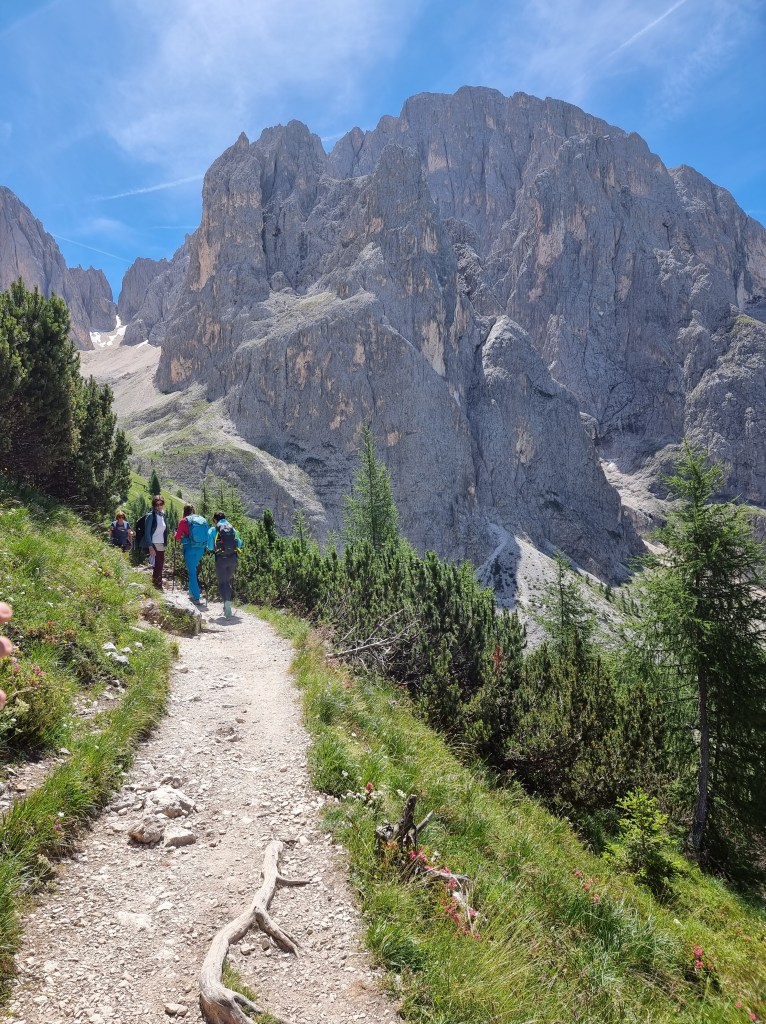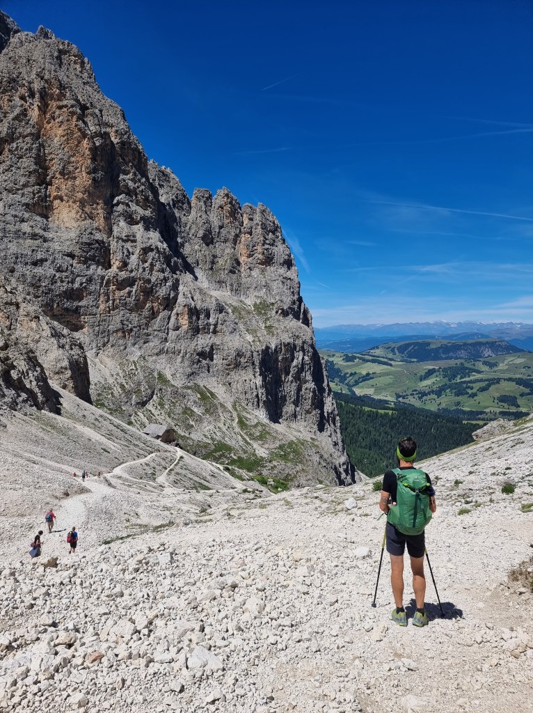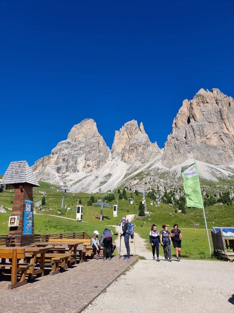 Da qui, passerete il Rifugio Des Alpes e subito dopo comincerà una ripida discesa verso il Passo Sella. E’ molto ripida ma fattibile. Consiglio pertanto di avere già a portata di mano i bastoncini da trekking che in questa escursione sono essenziali.