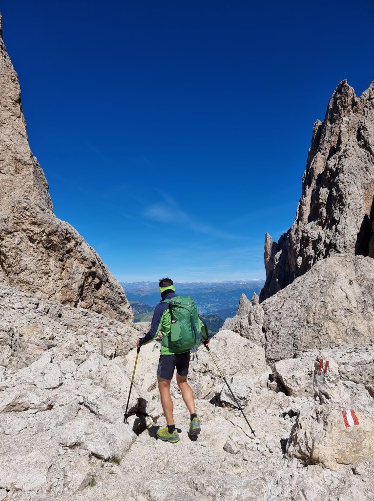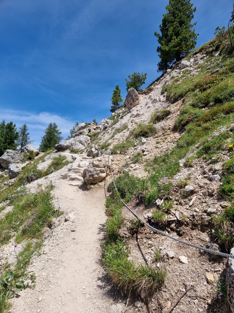 Arrivati al Rifugio Toni Demetz, comincia la parte più tecnica del percorso. Vi aspetta, seguendo il sentiero, una discesa molto tecnica ed impegnativa. Per dire, ci sono dei pezzi attrezzati con il cordino. Sono essenziali capacità tecniche e i bastoncini da trekking. Nulla di non fattibile. Ma non per tutti.