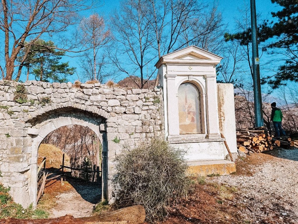Da qui potrete decidere come proseguire la passeggiata. Potete dirigervi verso il Monte Altare oppure, seguendo il mio giro potete scendere lungo la Via Crucis che, ripidamente, ma su un sentiero del 1730 e recentemente restaurato dagli Alpini locali, vi porterà praticamente nei pressi del Castello di San Martino con’ un continuo alternarsi di scalette e strada sterrata, accompagnate da 14 capitelli.