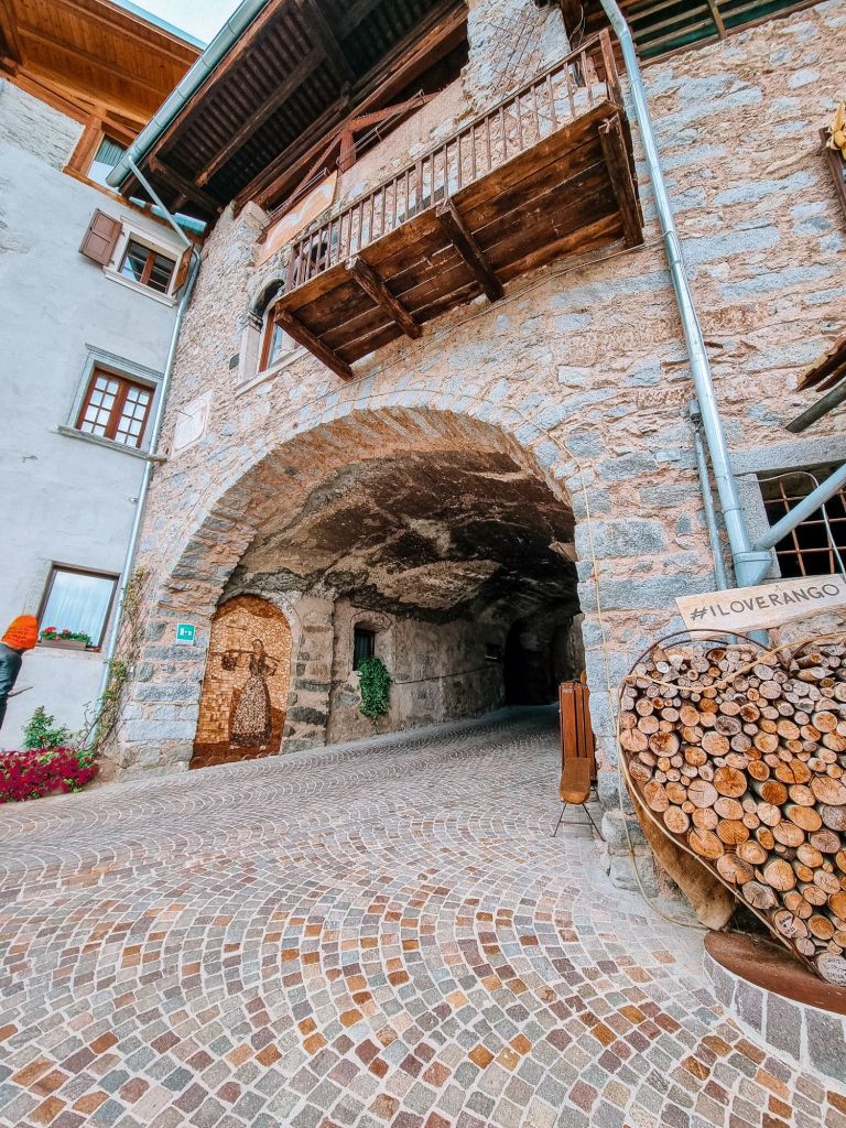 La cosa bella della visita al borgo è potersi perdere tra i suoi vicoli e le viuzze, assaporandone la tranquillità con lentezza. Poter ammirare le bellissime staccionate colme di pannocchie e le cantine interrate dove un tempo venivano conservati i prodotti della terra e le famose noci della zona. Poter passare tra i vari portici e ponticelli che collegano le case, i caratteristici portech, in dialetto locale, che consentivano di muoversi restando protetti anche in caso di pioggia.