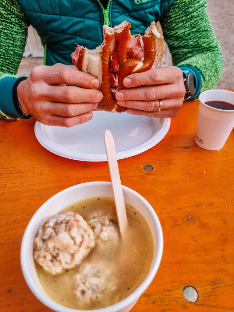 Tra le casette in legno potrete poi gustarvi un buon piatto di canederli in brodo, di tortei di patate, di frittelle di mele e di un buonissimo e corroborante vin brulè.