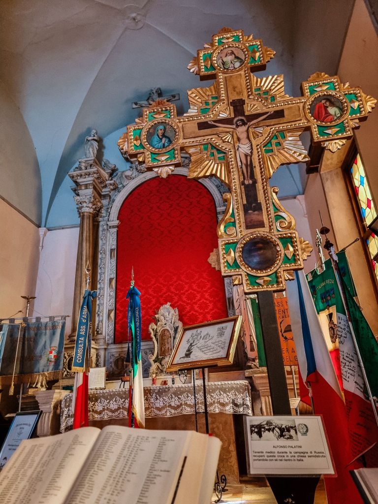 - il Crocifisso Ortodosso. Il tenente medico vittoriese Alfonso Palatini, trovò questo crocifisso durante la campagna di Russia in una chiesa semidistrutta e decise di portarlo con sé nel rientro in Italia. In collaborazione con il nostro Seminario vescovile, è stato predisposto il restauro per poi essere esposto nei pressi dell’abside del Sacrario. Bellissimo e mistico!